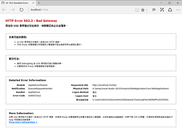 這個問題很怪, 在 Visual Studio 2015 裡面開發一個 ASP.NET Core 1.0.0 RC2 的 Web Application, 執行時瀏覽器跑了快兩分鐘之久, 然後就出現 Bad Gateway 的錯誤訊息.